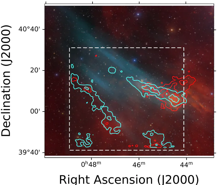 Contours of emission in the JAST80 observations on the nebula, for [O II] (filter J0378) in cyan, and for H_alpha in red (filter J0660)Abstract